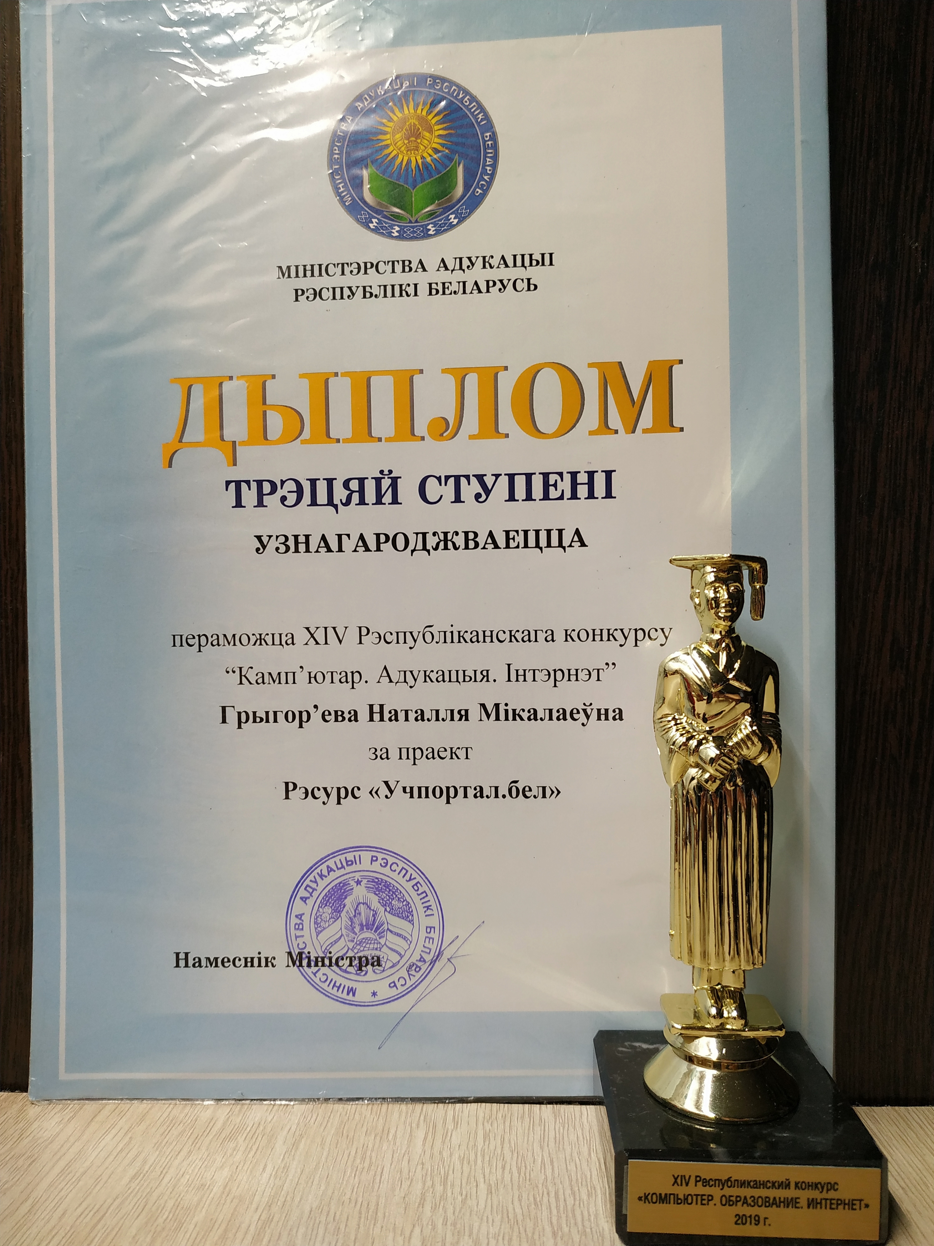 Проект учителя английского языка Григорьевой Н.Н. "Ресурс учпортал.бел" получил диплом III степени в номинации «Электронный учебный модуль для II и III ступеней общего среднего образования».
