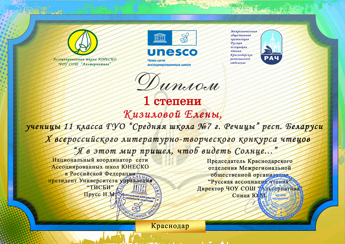 Кизилову Елену, учащуюся 11 класса, завоевавшую диплом I степени, и