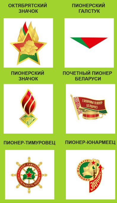 Значок Октябрятский – знак отличия в виде пятиконечной звездочки, три верхних луча которой окрашены в красный цвет, два нижних – в зеленый. В центре – барельеф карты Республики Беларусь золотистого цвета. От верхних лучей устремляются ввысь три языка пламени, часть первого окрашена в красный и зеленый цвета, соответствующие цветам Государственного флага Республики Беларусь. Звездочка окантована золотистым цветом