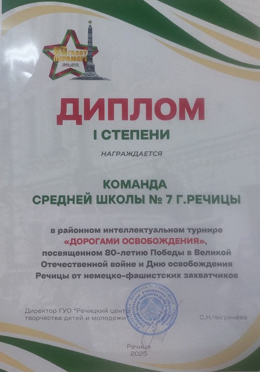 В рамках 80-летия Победы в Великой Отечественной войне и ко Дню освобождения Речицы от немецко-фашистских захватчиков в Речицком центре творчества детей и молодежи прошел районный интеллектуальный турнир для школьников "Дорогами освобождения".