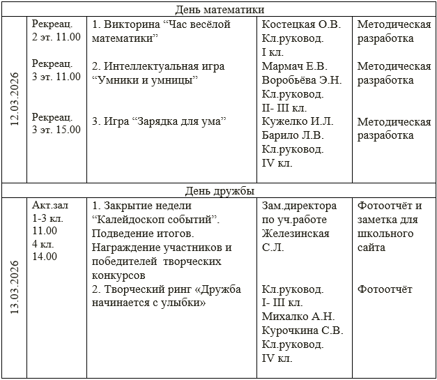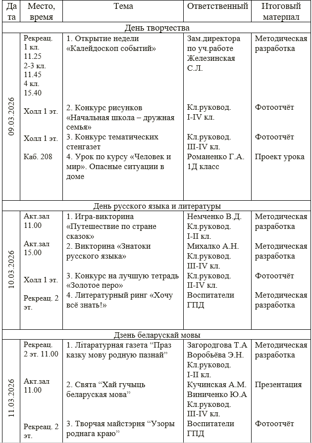 Готовимся к ней мы заранее. У нас запланирована большая программа: в течение этой недели все ребята 1-4 классов будут участвовать в интеллектуальных и творческих конкурсах, викторинах, тематических праздниках по учебным предметам. А в конце недели мы подведём итог: определим самых активных участников, победителей конкурсов и викторин. В первый день недели, 9 марта, у учащихся начальных классов прошли организационные линейки, где ребят познакомили с планом проведения Недели. На конкурс были представлены тематические стенгазеты от каждой параллели, а также рисунки по теме «Начальная школа - дружная семья». Сегодня, 10 марта, проводится День русского языка и литературы. К этому дню ребята подготовили свои лучшие тетради на конкурс «Пиши красиво и аккуратно». В холле первого этажа размещена выставка всех конкурсных работ. В группах продленного дня проходит сегодня литературный ринг «Хочу все знать». Приглашаем всех ребят поучаствовать в интересных мероприятиях и показать свои таланты!