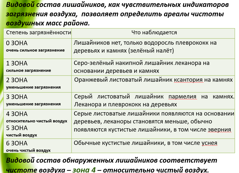 I. Изучили степень загрязнения атмосферного воздуха методами биоиндикации (лишайники) в микрорайоне учреждения образования.