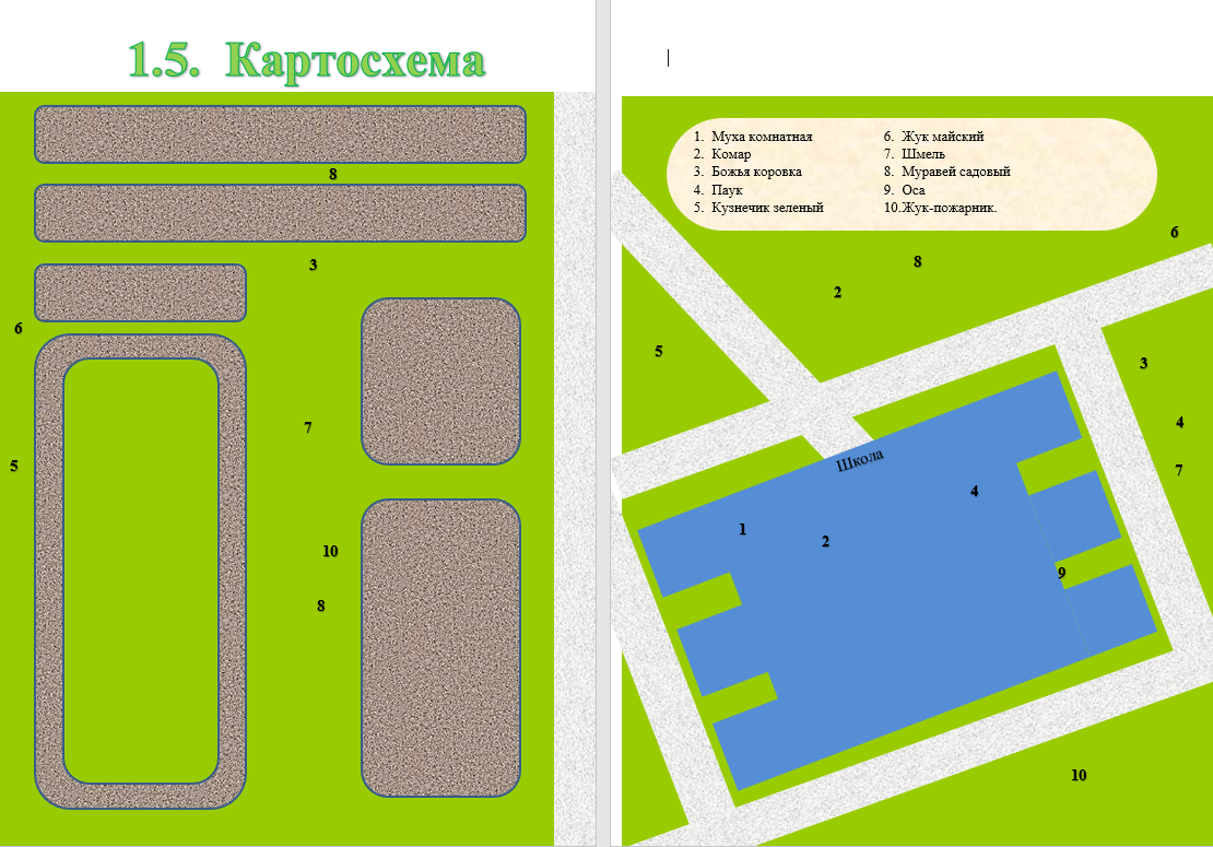 Также совместно с учителем биологии Демиденко М.Н. была состав-лена картосхема с расположением опознанных наземных насекомых на территории учреждения.